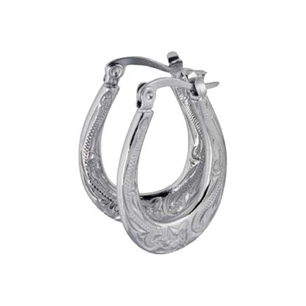 Náušnice z chirurgickej ocele oválneho tvaru. Povrch náušníc je zdobený gravírovaným vzorom. Náušnice majú rozmer 25x18mm. Náušnicové zapínanie je na francúzsky zámok.