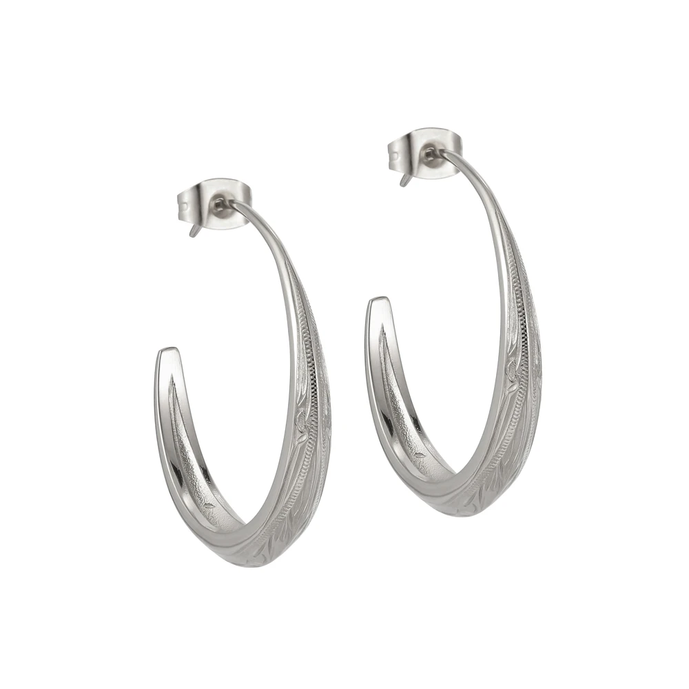 Kruhové náušnice vyrobené z chirurgickej ocele. Povrch náušnice je leštený zdobený gravírovaným vzorom. Náušnicové zapínanie je na puzetky. Vonkajší priemer náušníc 30mm, vnútorný priemer 26mm, šírka náušníc 4mm. Uvedená cena platí za pár.