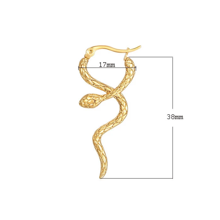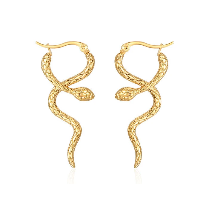 Hadie náušnice z chirurgickej ocele. Pozlátený povrch náušníc je leštený s vzorom hadej kože. Náušnice sú dlhé 38 mm. Náušnicové zapínanie je na francúzsky zámok