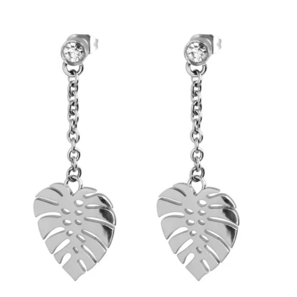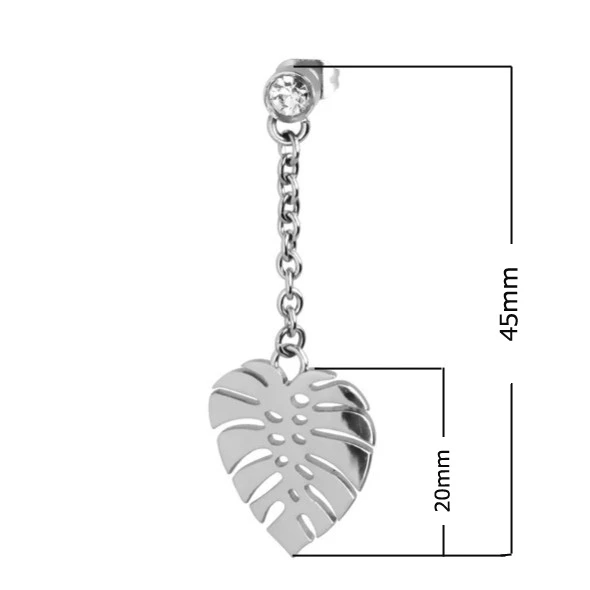 Náušnice z chirurgickej ocele s príveskami lístočkov a zirkónmi. Povrch náušníc je leštený. Náušnice sú dlhé 45mm. Celkové rozmery náušníc nájdete na podpornej fotografii. Náušnicové zapínanie je na puzetky. Náušnice sú dodávané v semišovom sáčku s logom Inori.