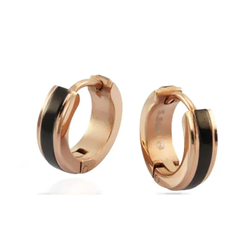 Náušnice krúžky z chirurgickej ocele. Leštený povrch náušníc kombinuje čiernu farbu s farbou ružového zlata. Náušnice sú široké 4mm, vonkajší priemer náušníc 13mm. Náušnicové zapínanie je na kĺb.