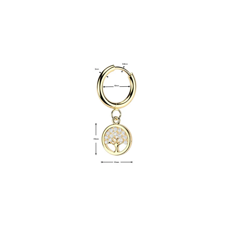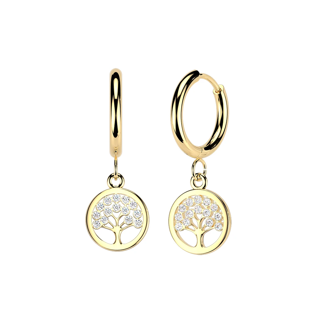 Kruhové náušnice s ozdobou stromu života. Povrch náušníc je leštený, ozdoba so stromom života je osadená čírymi zirkónmi. Vnútorný priemer krúžku 10mm, vonkajší priemer 14mm. Ozdoba so stromom života má priemer 10mm. Celková dĺžka náušnice 27mm. Náušnicové zapínanie je kĺbové. Uvedená cena platí za pár.