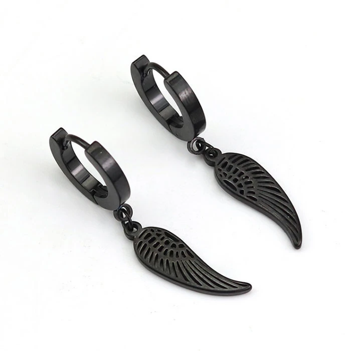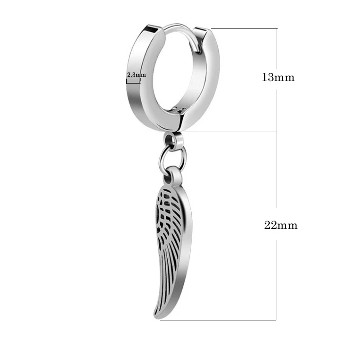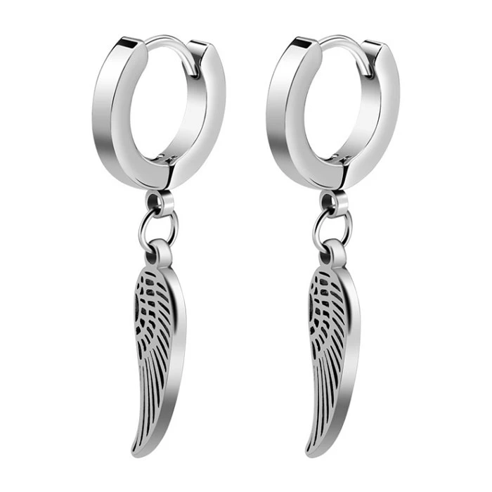 Náušnice krúžky z chirurgickej ocele. Povrch náušnice je leštený. Krúžok je široký 2,3mm, vonkajší priemer krúžku 13mm. Celková dĺžka náušnice s ozdobou krídla 35mm. Uvedená cena platí za pár náušníc.