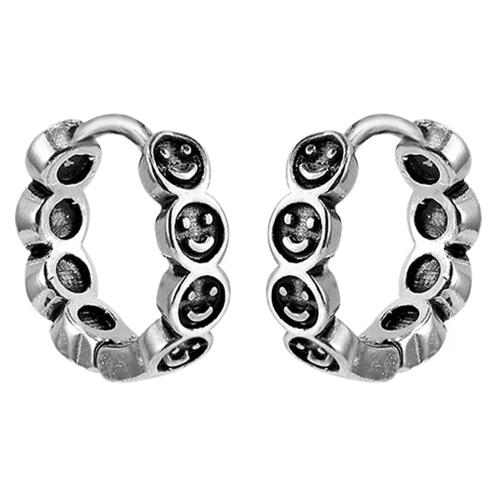 Náušnice krúžky z chirurgickej ocele. Náušnice tvoria spojené ikony smajlíkov. Krúžky majú vnútorný priemer 10mm, vonkajší priemer 14mm. Náušnicové zapínanie je kĺbové.