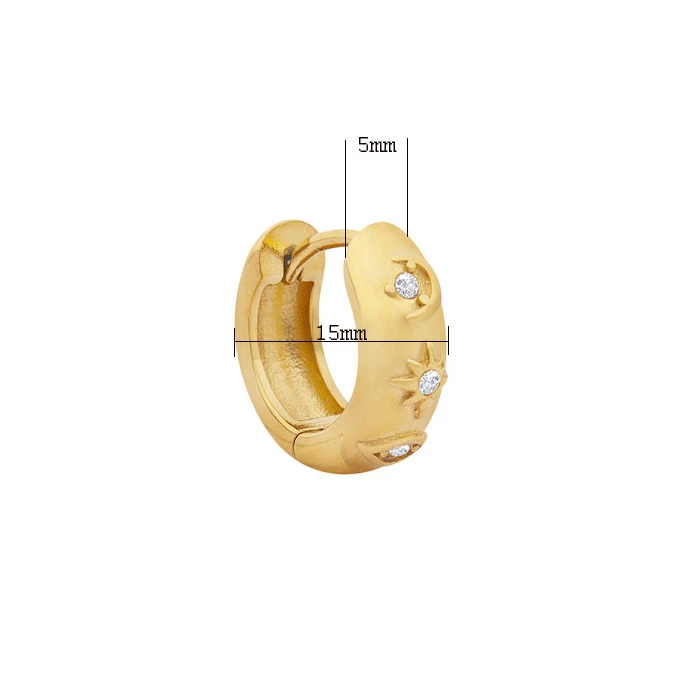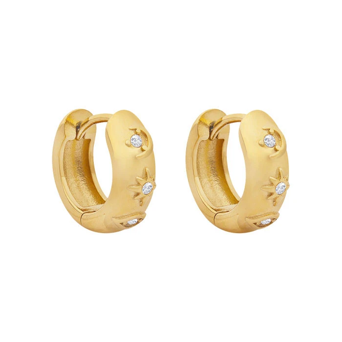 Náušnice krúžky z chirurgickej ocele. Náušnice sú ozdobené symbolmi mesiaca a hviezd. Vonkajší priemer náušníc 15mm, šírka náušníc 5mm. Náušnicové zapínanie je kĺbové.