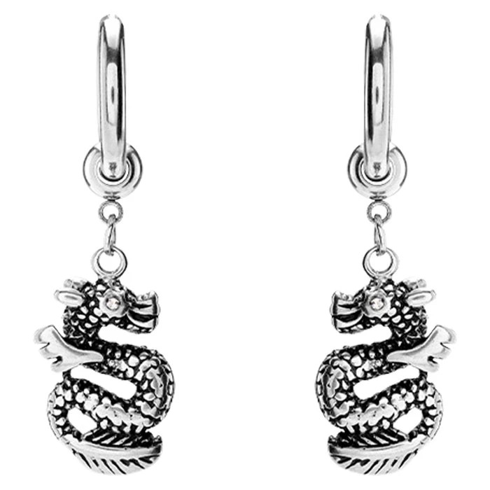 Visiace náušnice z chirurgickej ocele s drakom. Náušnice tvoria krúžok s vonkajším priemerom 15mm, na ktorom je zavesený prívesok draka dlhý 25mm. Celková dĺžka náušnice 42mm. Náušnicové zapínanie je kĺbové.