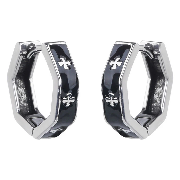 Náušnice vyrobené z chirurgickej ocele v tvare šesťhranu. Pohľadová strana je ozdobená krížmi zvýraznenými čiernou farbou. Zadná strana náušníc je hladká leštená bez motívu. Rozmer náušníc 14x14mm. Náušnicové zapínanie je kĺbové.