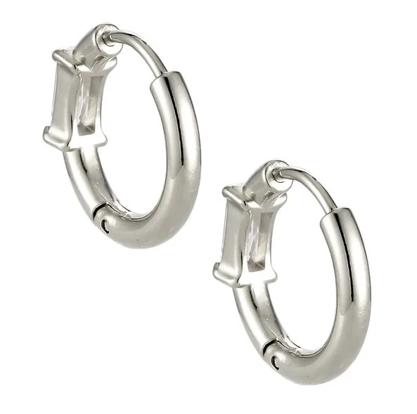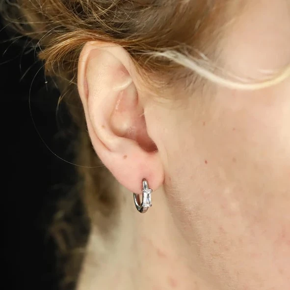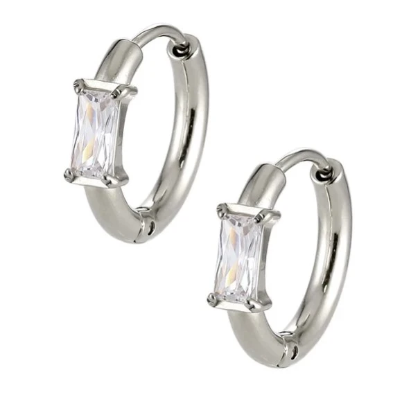 Náušnice krúžky z chirurgickej ocele. Náušnice sú ozdobené trblietavými zirkónmi v tvare obdĺžnika. Vonkajší priemer náušníc 16mm, vnútorný priemer 11mm. Šírka náušníc 2,3mm. Cena je uvedená za pár.