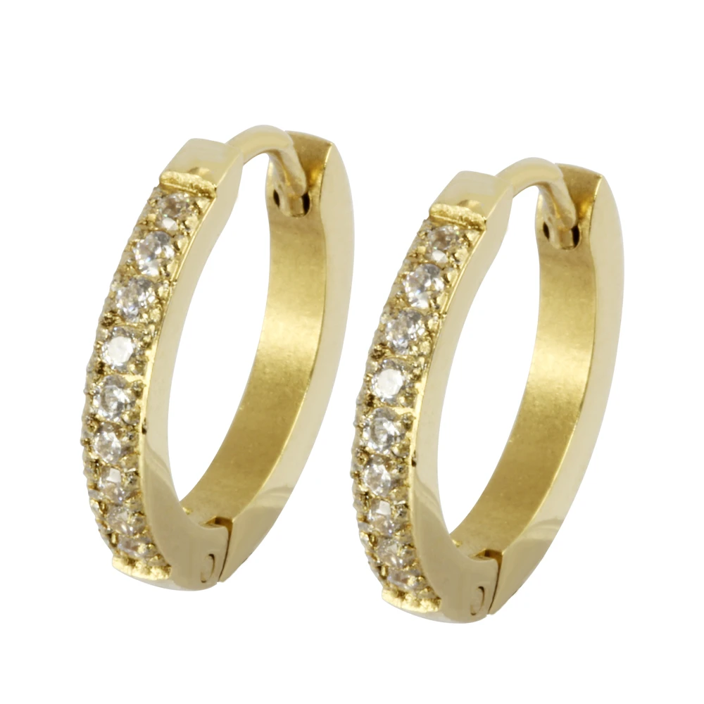 Náušnice väčšie krúžky z chirurgickej ocele. Povrch náušnice je pozlátený technológiou PVD. Náušnice sú ozdobené trblietavým zirkónmi. Vonkajší priemer náušníc 15mm, vnútorný priemer 11mm. Šírka náušníc 2mm. Cena je uvedená za pár.