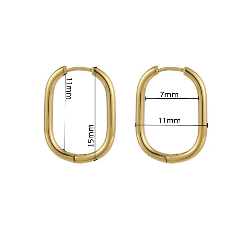 Náušnice z chirurgické oceli visací ve tvaru oválku. Povrch náušnic je leštěný. Náušnice jsou široké 11mm, dlouhé 15mm. Všechny rozměry náušnic najdete na podpůrné fotografii. Zapínání náušnic je kloubové. Cena je uvedena za pár.
