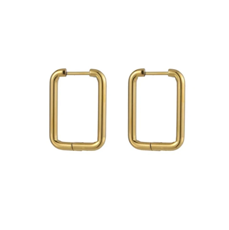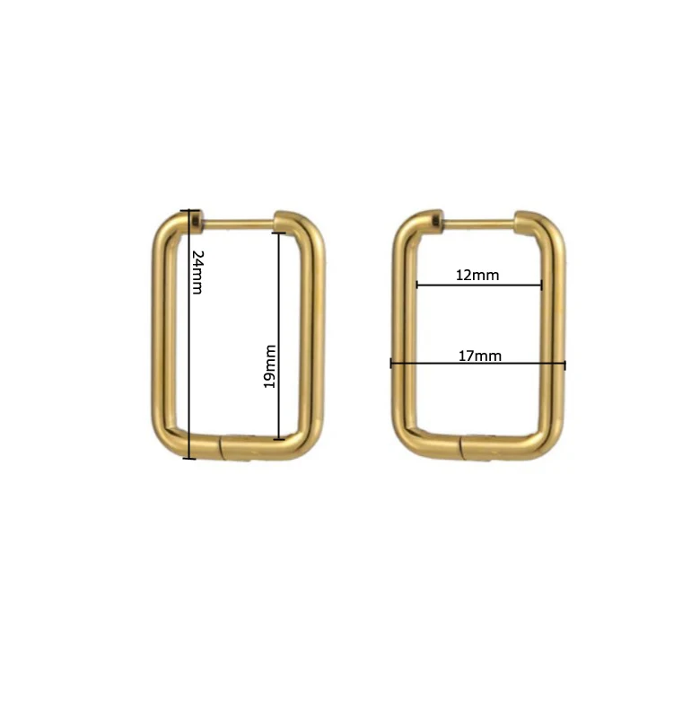 Náušnice z chirurgickej ocele visiace v tvare obdĺžnika. Povrch náušníc je leštený. Náušnice sú široké 17mm, dlhé 24mm. Všetky rozmery náušníc nájdete na podpornej fotografii. Zapínanie náušníc je kĺbové. Cena je uvedená za pár.