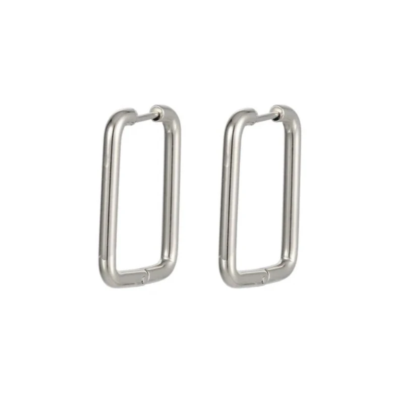 Náušnice z chirurgickej ocele visiace v tvare obdĺžnika. Povrch náušníc je leštený. Náušnice sú široké 20mm, dlhé 25mm. Všetky rozmery náušníc nájdete na podpornej fotografii. Zapínanie náušníc je kĺbové. Cena je uvedená za pár.