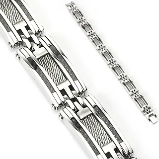Náramok z chirurgickej ocele 316L. Náramok má leštený povrch. Stredom náramku prechádzajú oceľová lanka. Okraje náramku sú ozdobené karbónom. Náramok je široký 13mm.