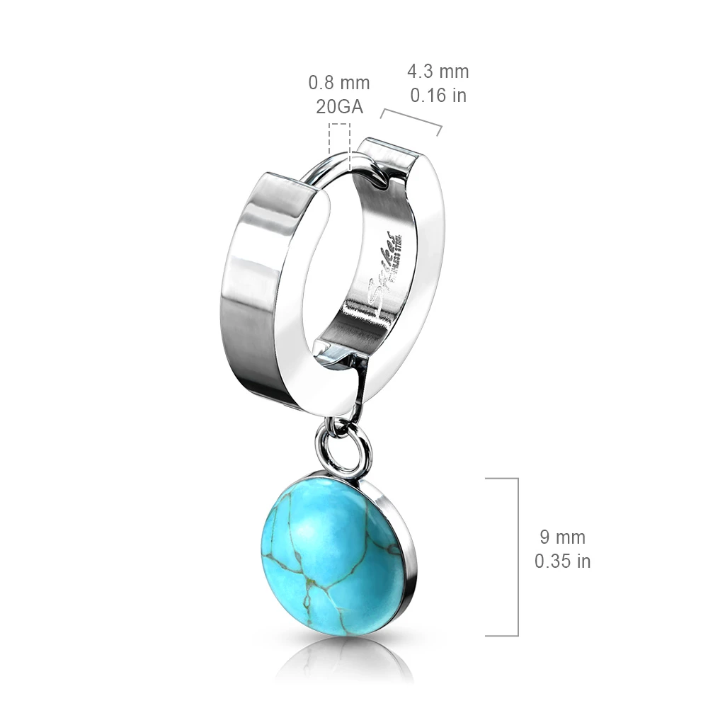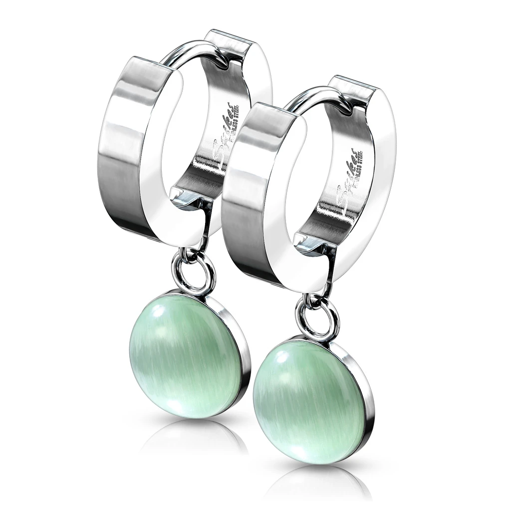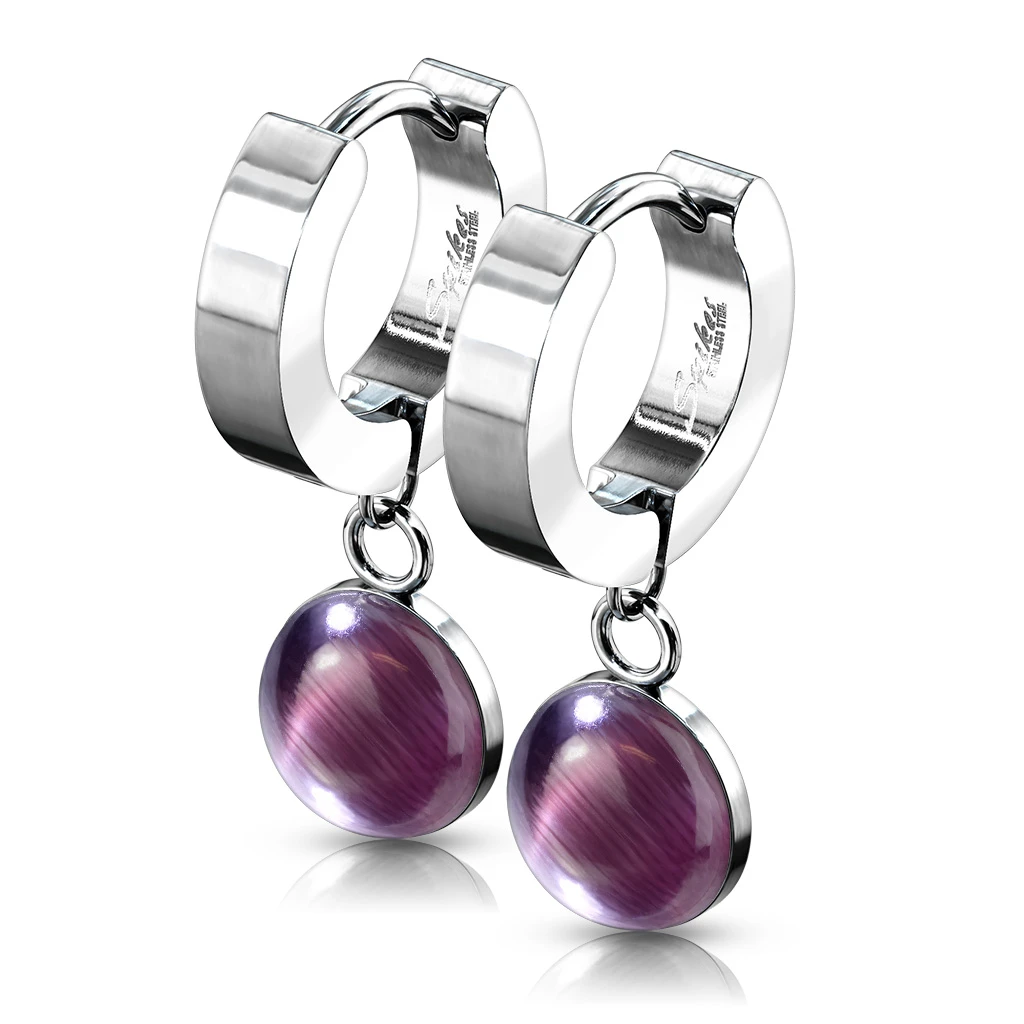 Oceľové náušnice krúžky s príveskom ozdobeným prírodnými kameňmi. Náušnice majú vonkajší priemer náušníc 13 mm, šírka 4,3 mm. Prívesok má priemer 9 mm. Uvedená cena platí za pár náušníc.