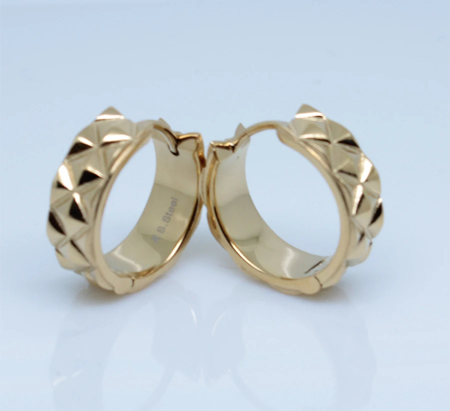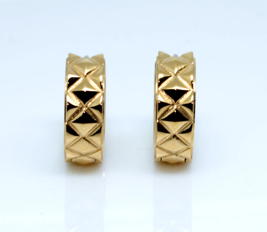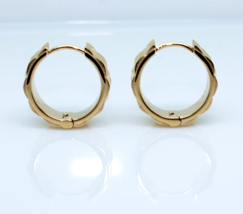 Náušnice krúžky z chirurgickej ocele. Povrch náušníc je leštený pozlátený technológiou PVD. Náušnice sú široké 6mm, vnútorný priemer náušníc 14mm, vonkajší priemer 18mm. Náušnicové zapínanie je kĺbové. Uvedená cena platí za pár.