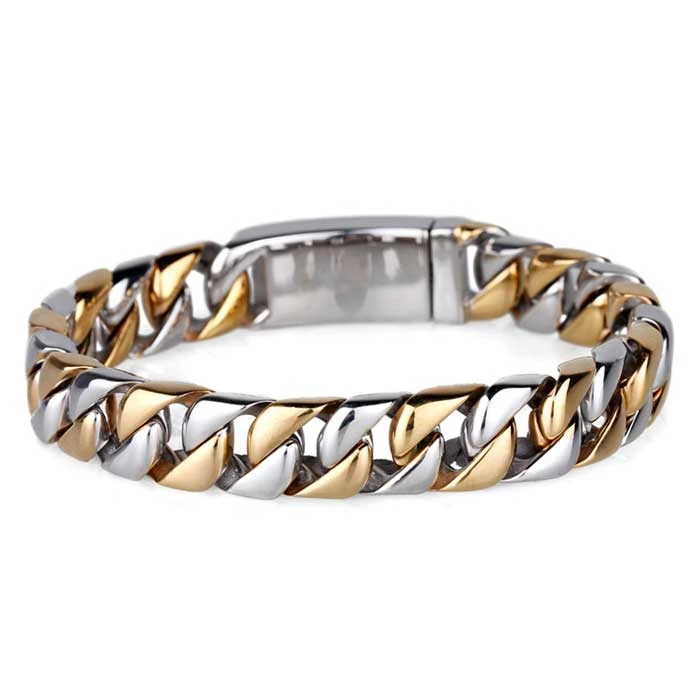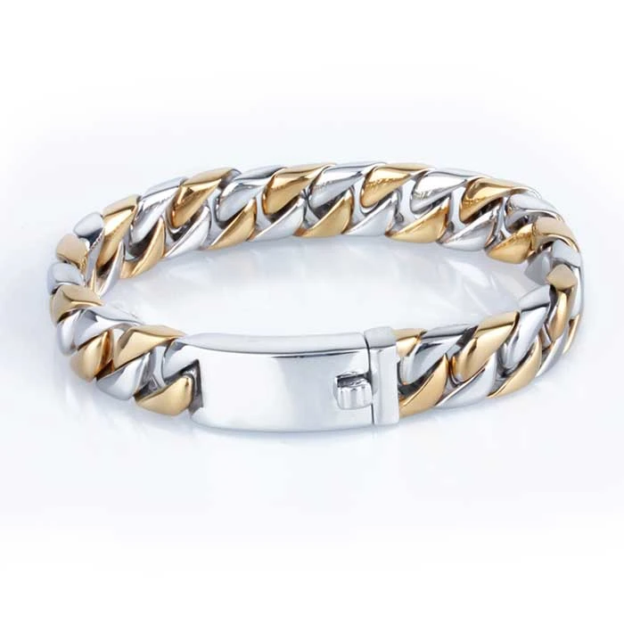Pánsky oceľový náramok na ruku. Povrch náramku je kombinácia leštenej ocele a zlatenie technológií IP. Šírka náramku 12mm. Dĺžka náramku 22cm.