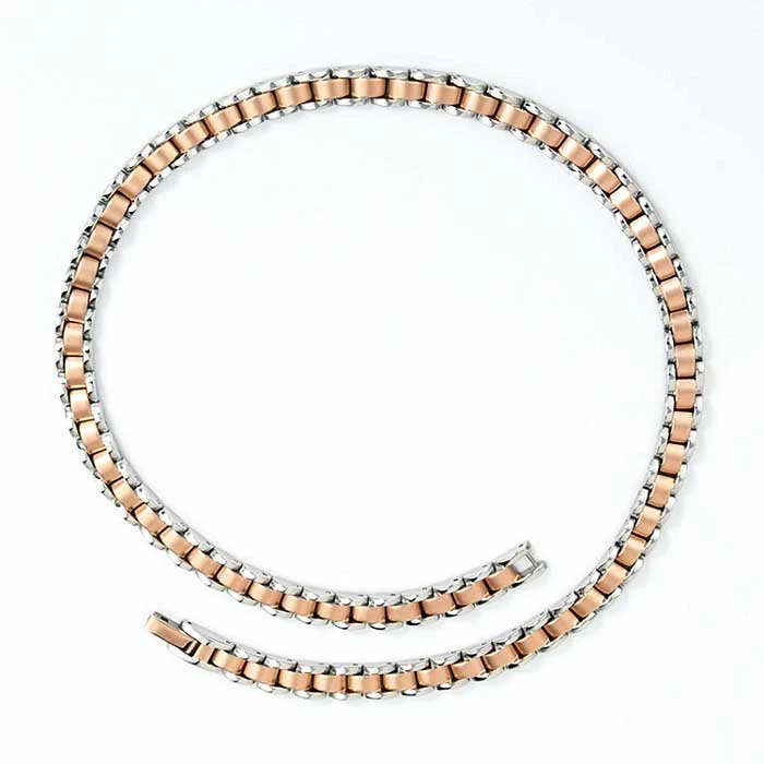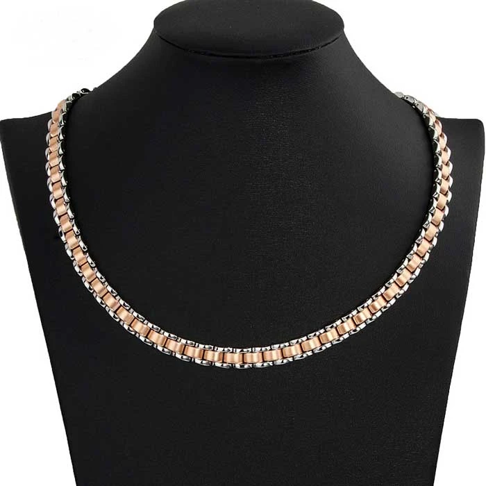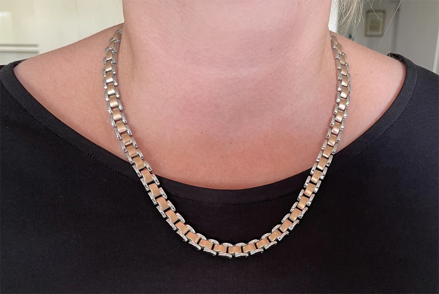 Náhrdelník z chirurgickej ocele s magnetmi. Články náhrdelníka kombinujú leštenú oceľ s matnou bronzovou farbou. Náhrdelník má zapínanie na klip. Šírka náhrdelníka 8mm, dĺžka 50cm. Na prianie je možné tento magnetický náhrdelník zadarmo skrátiť. Hmotnosť náhrdelníka 75g.