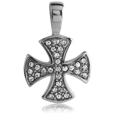Prívesok krížik z chirurgickej ocele zdobený zirkónmi. Krížik ma rozmer 14x14mm, očkom pre zavesenie prívesku na retiazku možno pretiahnuť žetízek s priemerom do 3,0mm.