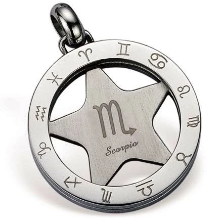 Prívesok so znamením škorpióna (24.10 - 22.11). Prívesok je vyrobený z chirurgickej ocele. Znamenie škorpióna je "lemované" symbolmi ostatných znamení zverokruhu. Súčasťou znamenia je retiazka z chirurgickej ocele vzor pancr so zapínaním na karabínu, dlhý 60cm. Prívesok má priemer 25mm. Na prianie je možné retiazku zadarmo skrátiť.