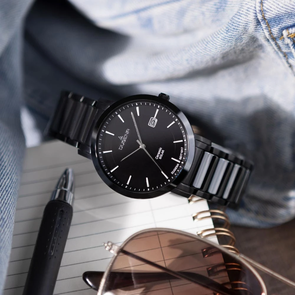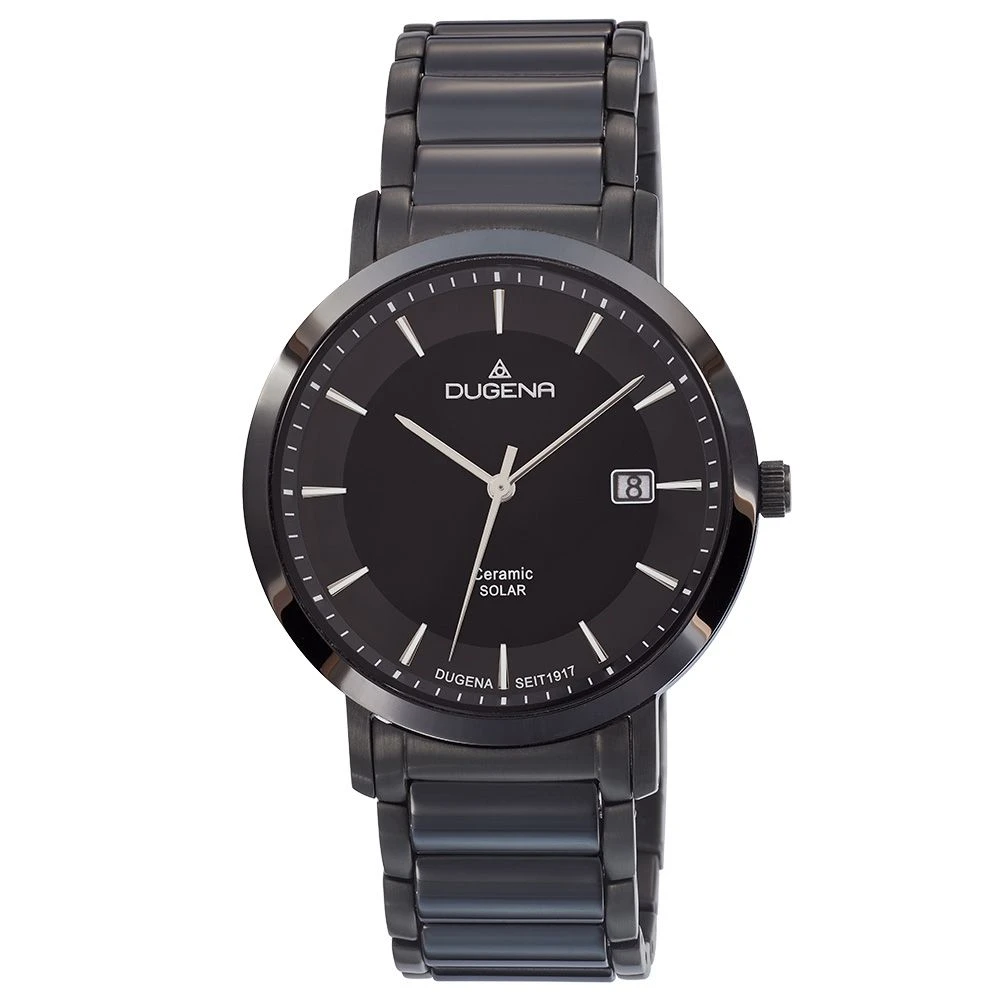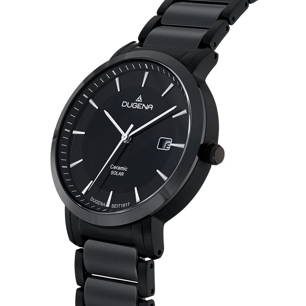Hodinky pre mužov od Nemeckého výrobcu Dugena. Pánske náramkové hodinky kombinujúce ušľachtilú oceľ s keramikou. Hodinky sú vybavené ukazovateľom dátumu, hodinovou, minútovou a sekundovou rúčkou. Čierny ciferník s indexmi. Puzdro hodiniek má priemer 40mm. Prevádzka hodiniek zaisťuje spoľahlivý strojček na solárny pohon. Hodinky sú dodávané v originálnej krabičke s logom Dugena. Tieto pánske hodinky sú vodeodolné na úrovni 5 ATM.