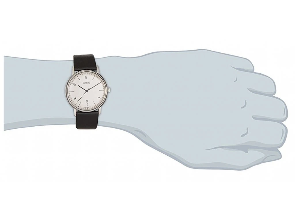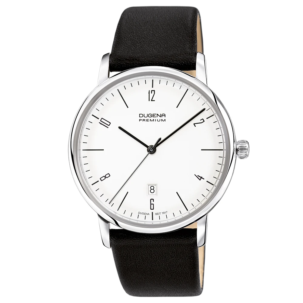 Pánske náramkové hodinky Dugena s koženým remienkom na jednoduchú pracku, sklíčko hodiniek je akrylové. Okrúhly biely ciferník s indexmi a číselníkom. Hodinky sú vybavené datumkou, hodinovou, minútovou a sekundovou rúčkou. Priemer puzdra hodiniek 38mm, výška puzdra 11mm. Puzdro hodiniek je vyrobené z chirurgickej ocele. Chod hodiniek zaisťuje spoľahlivý batériový strojček. Hodinky sú vodotesné na úrovni 3 ATM. Na všetky hodinky Dugena platí záruka v dĺžke 36 mesiacov. Hodinky sú dodávané v darčekovej krabičke s logom.