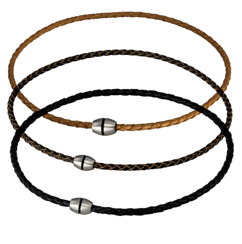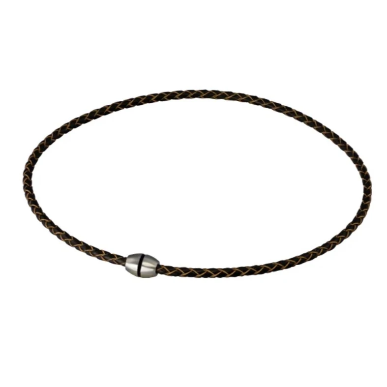 Kožený náhrdelník pre mužov s ozdobným zapínaním. Oceľové magnetické zapínanie má matný povrch po obvode zdobený čiernym prúžkom. Priemer zapínania 10mm. Kožená pletená časť náhrdelníka má priemer 4mm, dĺžka náhrdelníka 45cm.