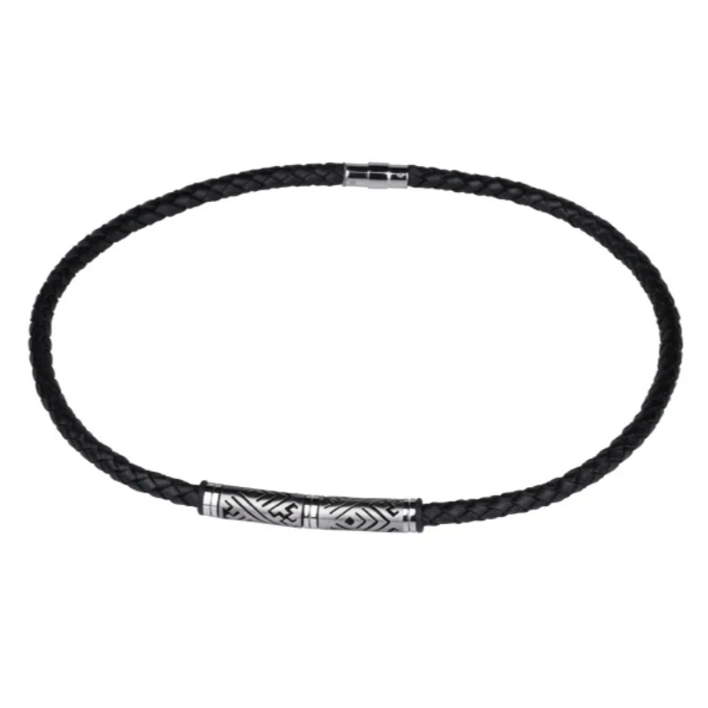 Kožený náhrdelník pre mužov s ozdobou z chirurgickej ocele. Zapínanie náhrdelníka je kombinácia systému bajonet a magnetu. Kožená pletená časť náhrdelníka má priemer 5mm, dĺžka náhrdelníka 48cm. Oceľová ozdoba má priemer 8mm.
