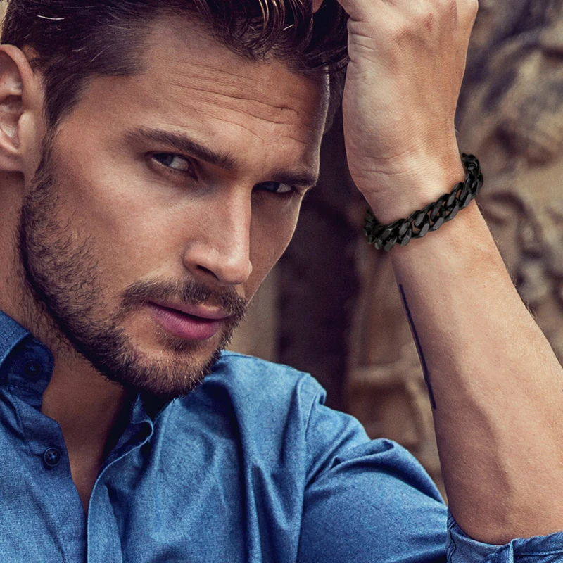 Klasický pánsky náramok na ruku z chirurgickej ocele. Oceľové náramky aj ostatné šperky z tohto materiálu sa stále tešia značnej obľube najmä vďaka vlastnostiam, ktoré má chirurgická oceľ. K týmto vlastnostiam patrí predovšetkým nevyvolávanie alergických reakcií, odolnosť proti poškodeniu, farebná stálosť, šperky z chirurgickej ocele neoxidujú a sú dostupné za zlomok ceny v porovnaní so šperkami z drahých kovov.