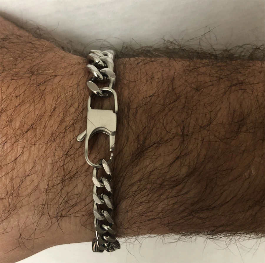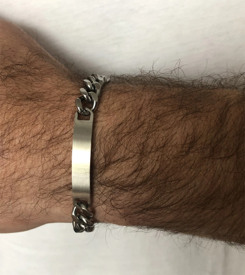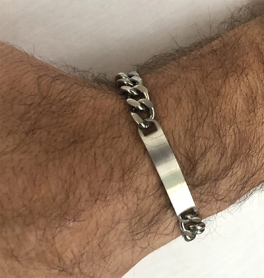 Náramok z chirurgickej ocele s doštičkou. Povrch náramku je matný. Rozmer doštičky 44x8mm. Náramok je široký 8mm, dĺžka 21cm. Zapínanie náramku je karabínové.