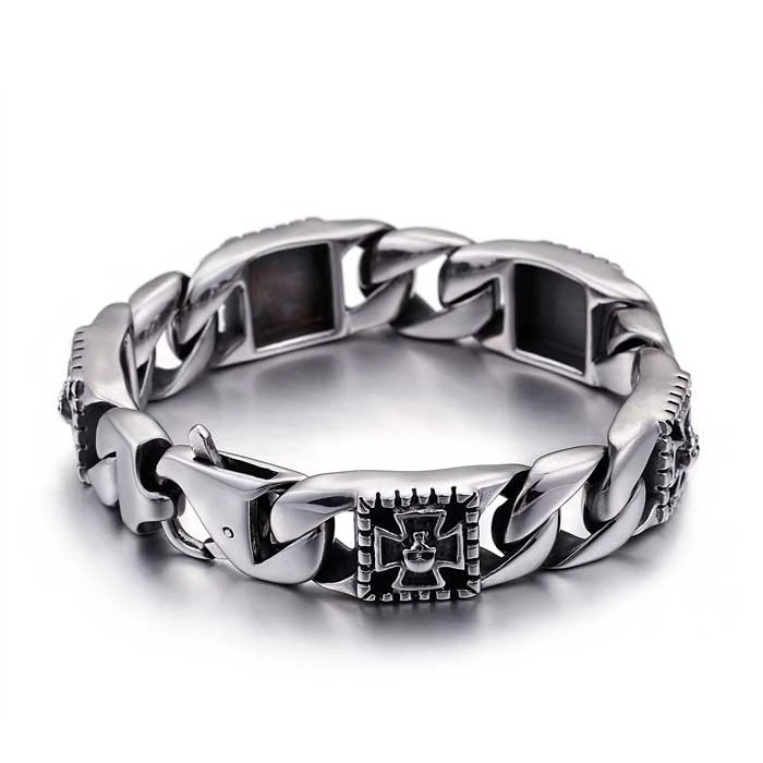 Náramok z chirurgickej ocele pre mužov. Povrch náramku je leštený. Lebky v maltézskych krížoch sú plastické na podklade s patinou. Dĺžka náramku 22cm, šírka 15mm. Náramok má zapínanie na masívne karabínu.