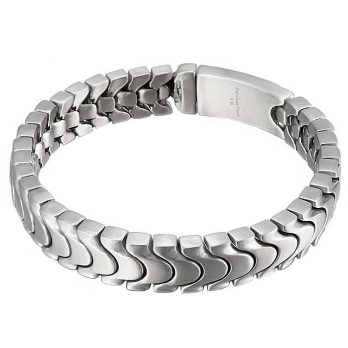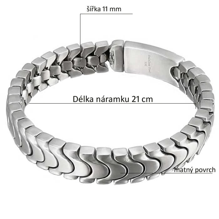 Náramok z chirurgickej ocele pre mužov. Povrch náramku je matný. Dĺžka náramku 21cm, šírka 11mm. Náramok má zapínanie na masívne klip.