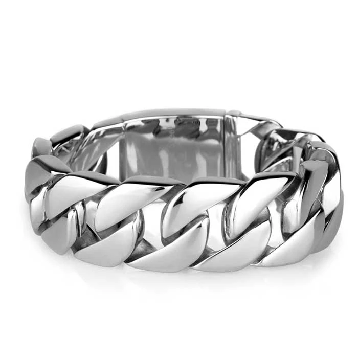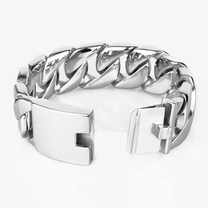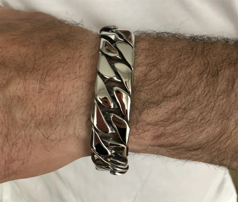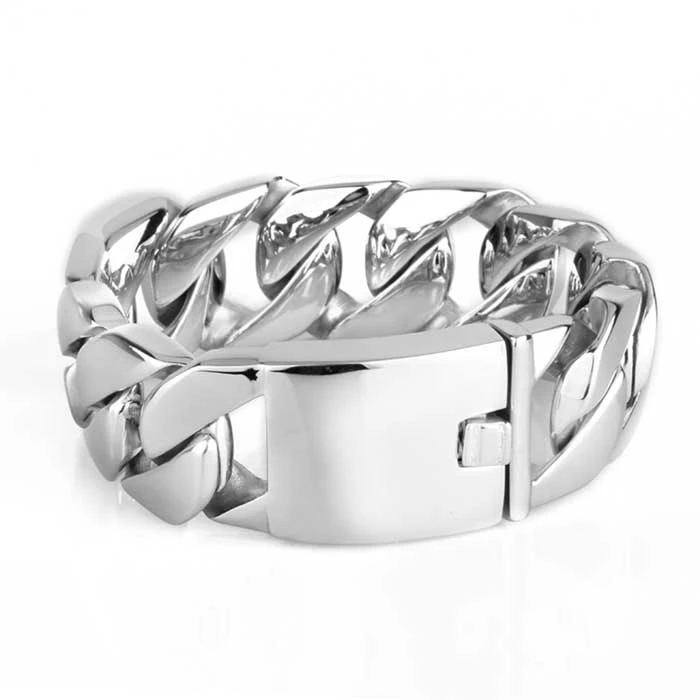 Náramok na ruku pre muža z chirurgickej ocele. Povrch náramku je leštený. Náramok je široký 20mm. Zapínanie náramku je na masívny klip.