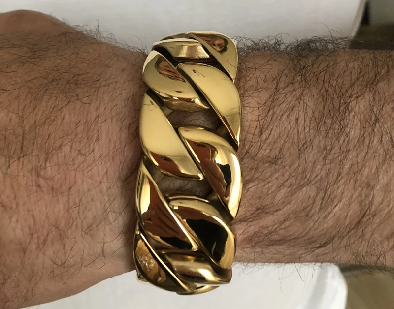 Náramok na ruku pre muža z chirurgickej ocele. Povrch náramku je leštený pozlátený technológiou IP. Náramok je široký 31mm. Zapínanie náramku je na masívny klip.