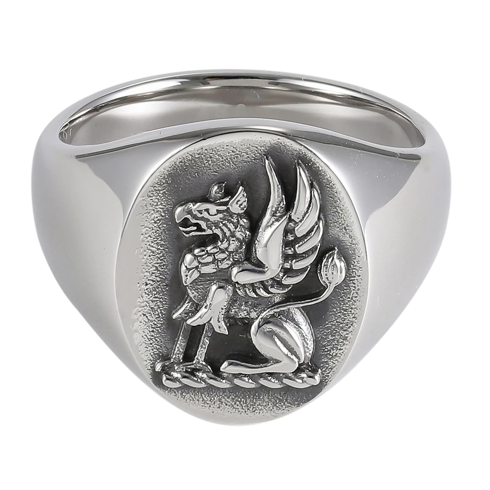Pečatný prsteň vyrobený z chirurgickej ocele. Povrch prsteňa je leštený. Rozmer pečatidla 17x14mm. Obrúčka prsteňa je v najužšom bode široká 3,0mm a postupne sa rozširuje na 17mm.