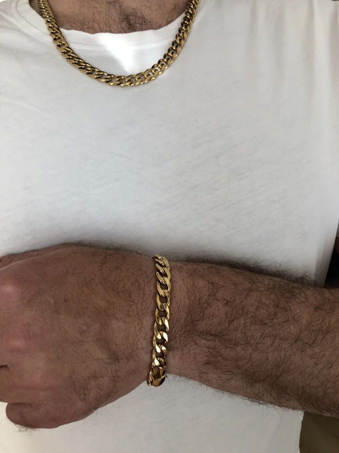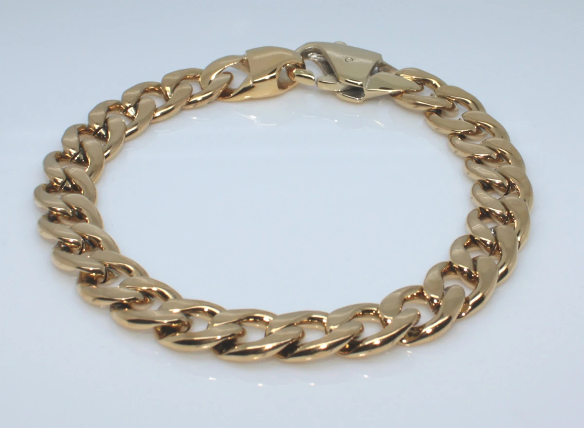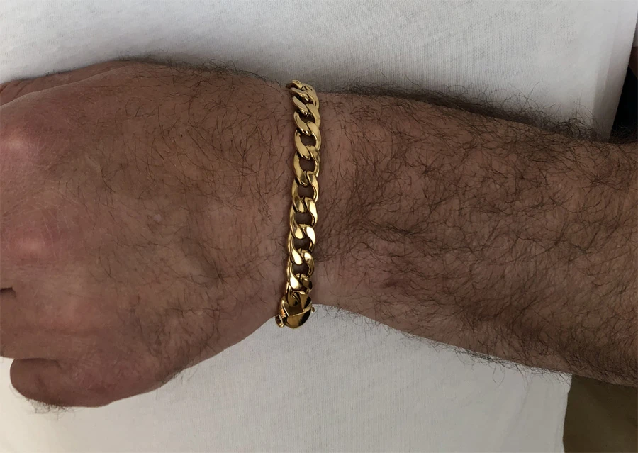 Náramok z chirurgickej ocele pre mužov s lešteným povrchom. Povrch náramku je pozlátený technológiou PVD. Zapínanie náramku je na karabínu. Dĺžka náramku 21,5cm, šírka 10mm.