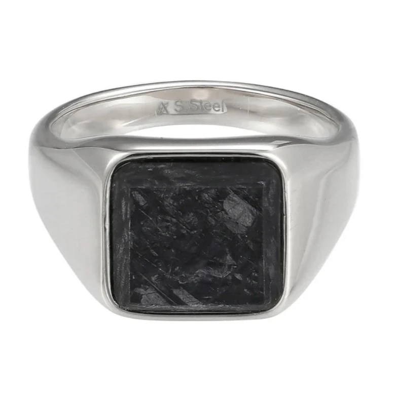 Pánsky pečatný prsteň s čiernou ozdobou z kovaného uhlíka. Prsteň je kvalitnej chirurgickej ocele a moderného odolného materiálu "kovaný uhlík". Spojenie týchto dvoch materiálov zaručuje prstenu odolnosť proti poškodeniu, korózii a poškriabaniu. Prsteň je ideálnym šperkom pre mužov, ktorí si cenia kvalitu a štýl.Neváhajte a objednajte tento prsteň pre mužov ešte dnes.