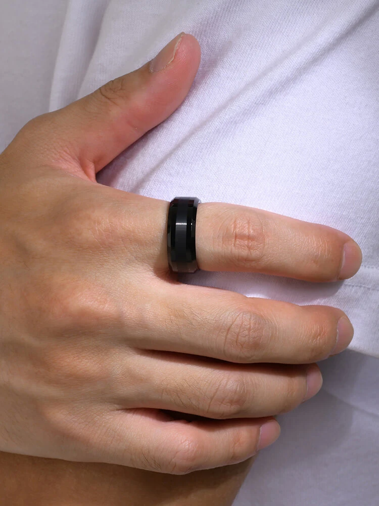 Pánsky volfrámový prsteň vo farbe pištoľovej čierne. Kraje prsteňa a jeho vnútorná strana sú leštené, stred prsteňa je matný bez povrchovej úpravy. Prsteň je široký 8mm.