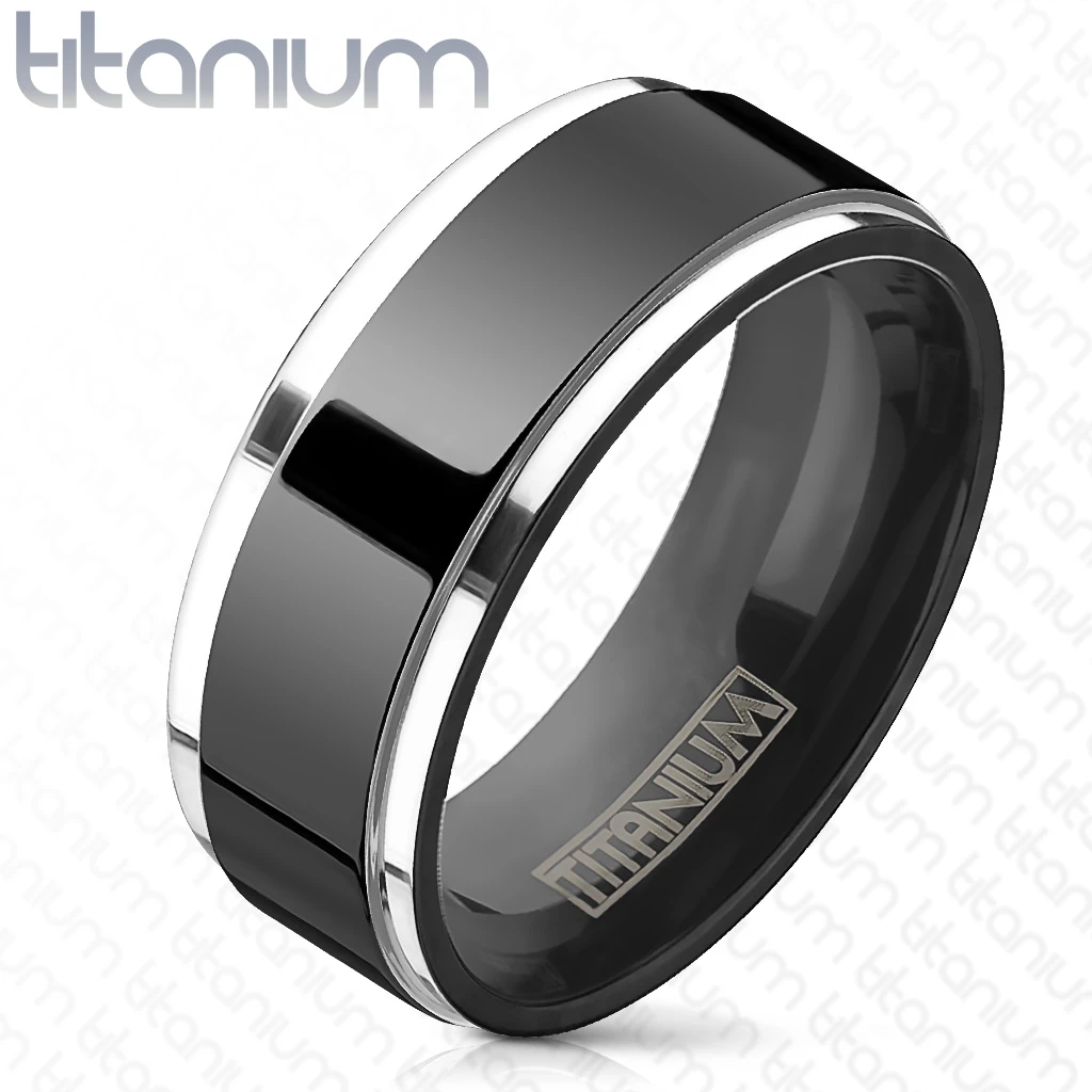 Titánový prsteň pre mužov. Povrch prsteňa je leštený upravený čiernou PVD farbou. Kraje prsteňa sú bez farebnej úpravy. Prsteň je široký 8mm.