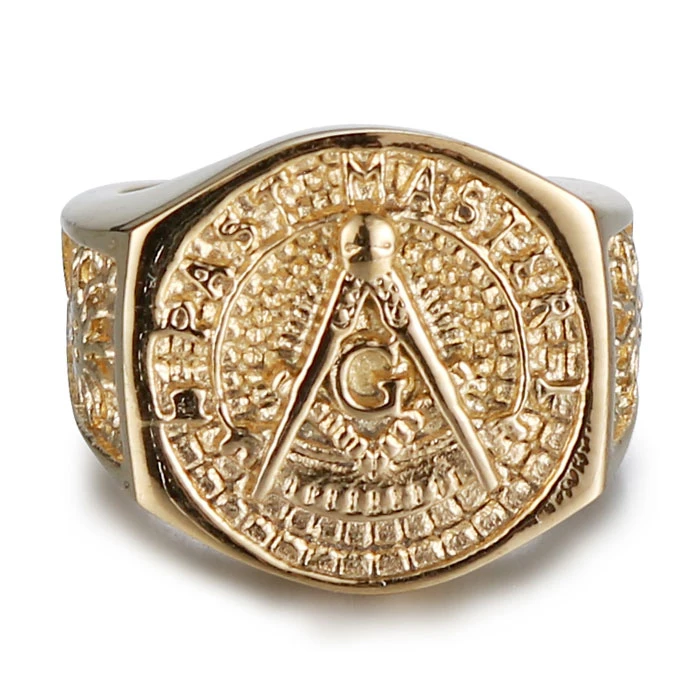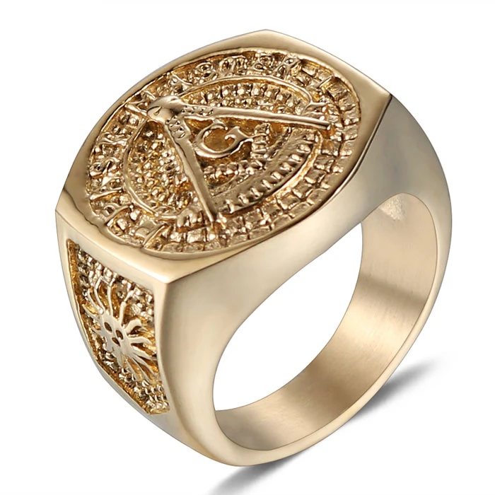 Pánsky pečatný prsteň z chirurgickej ocele so znakom slobodomurárov. Povrch pečatného prsteňa je upravený technológiou IP. Slobodomurárske symboly kružidlo, uholník a písmeno G sú na pečatný ploche, symbol slnka je na oboch stranách obrúčky. Rozmer pečatný plochy 20x20 mm. Obrúčka prsteňa je v najužšom mieste široká 6 mm a postupne sa rozširuje na 20 mm.