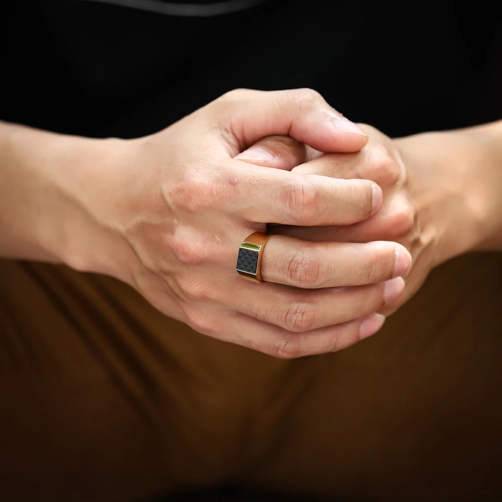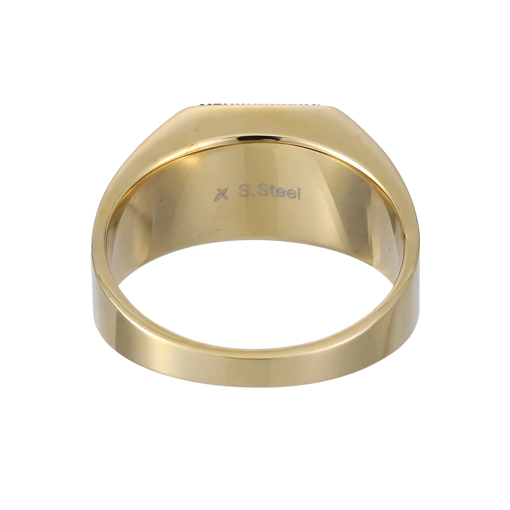 Prsteň z chirurgickej ocele pre mužov. Pečatný prsteň je leštený pozlátený technológiou PVD. Ozdobná časť prsteňa je vzorovaná. Rozmer ozdoby 9x9mm. Obrúčka prsteňa je v najužšom bode široká 3mm a postupne sa rozširuje na 9mm.