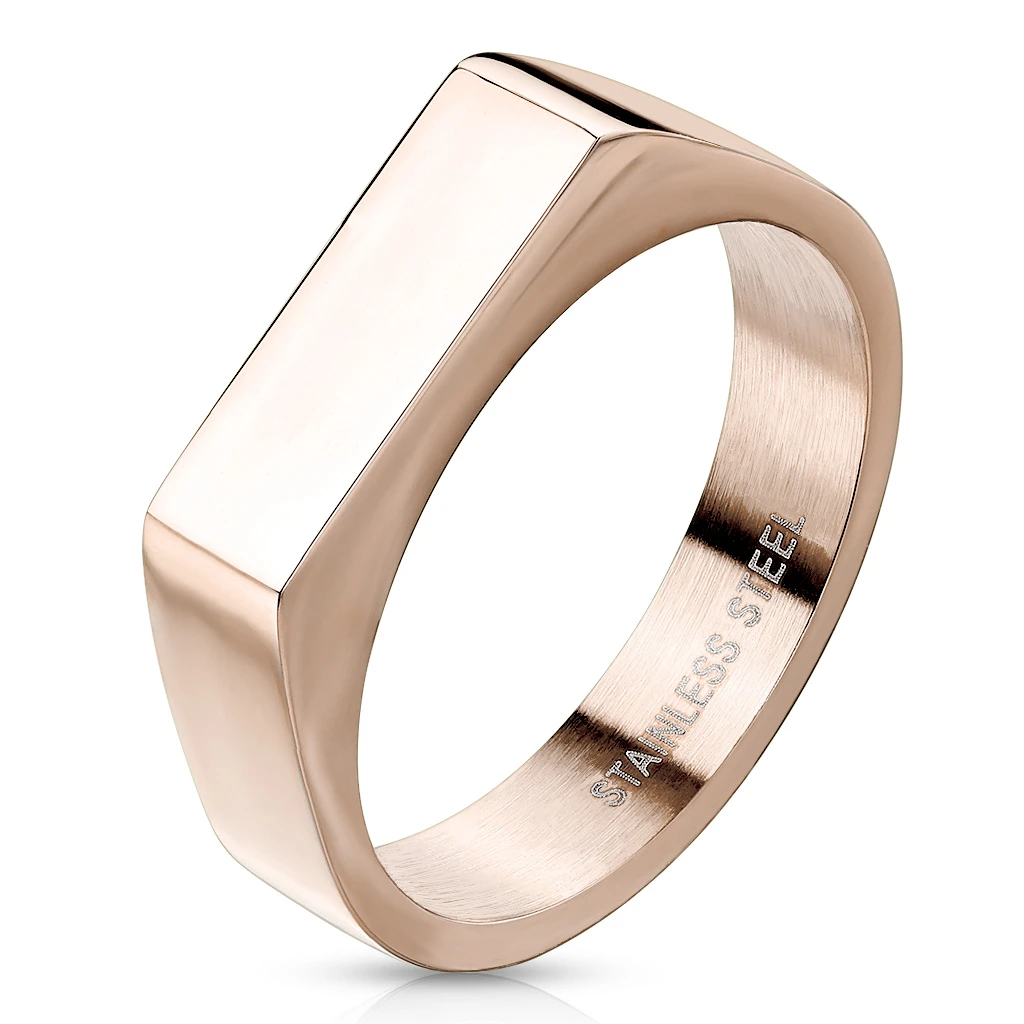 Oceľový pečatný prstienok pre ženy s lešteným povrchom pozláteným technológií PVD. Obrúčka prsteňa je široká 5mm. Rozmer pečatidla 5x14mm. Do pečatidla je možné vyryť napr. monogram.