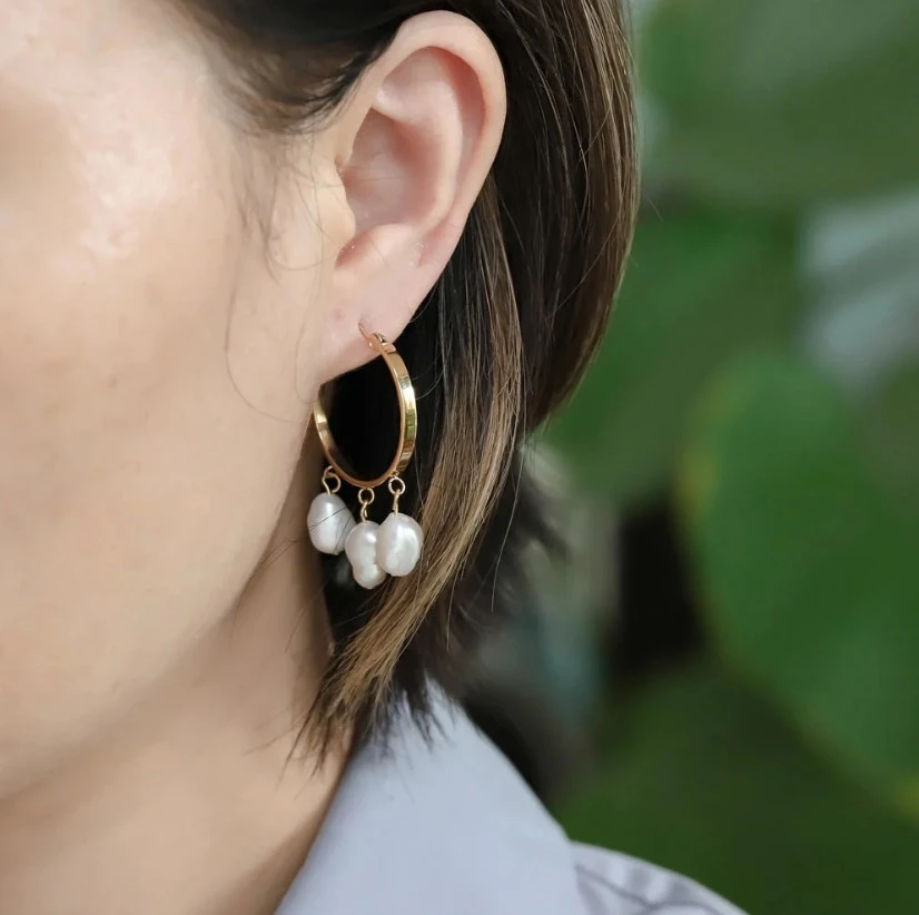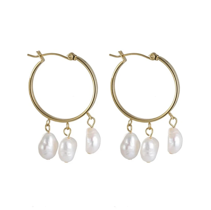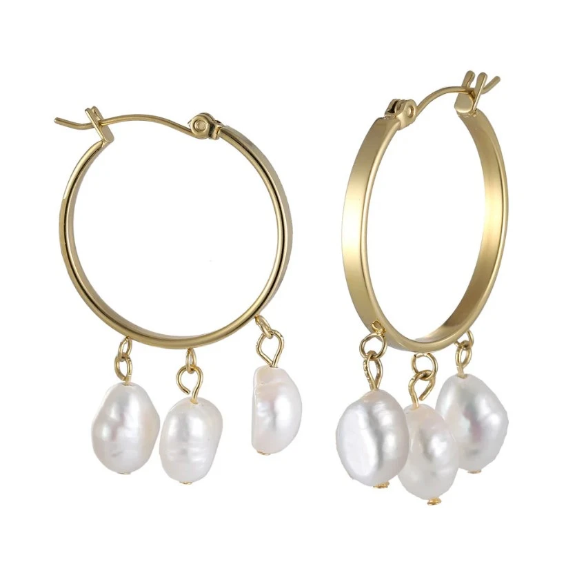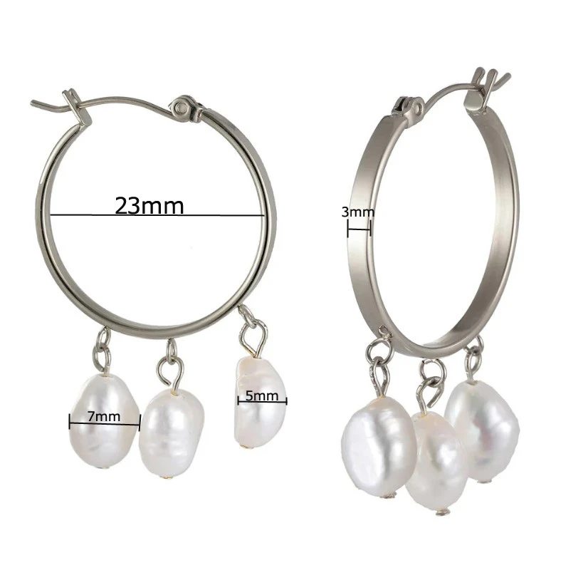 Kruhové náušnice z chirurgickej ocele ozdobené sladkovodnými perlami. Povrch náušníc je leštený pozlátený technológiou PVD, perličky majú bielu farbu. Vnútorný priemer náušníc 23mm, vonkajší 26mm. Náušnice majú zapínanie na francúzsky zámok.