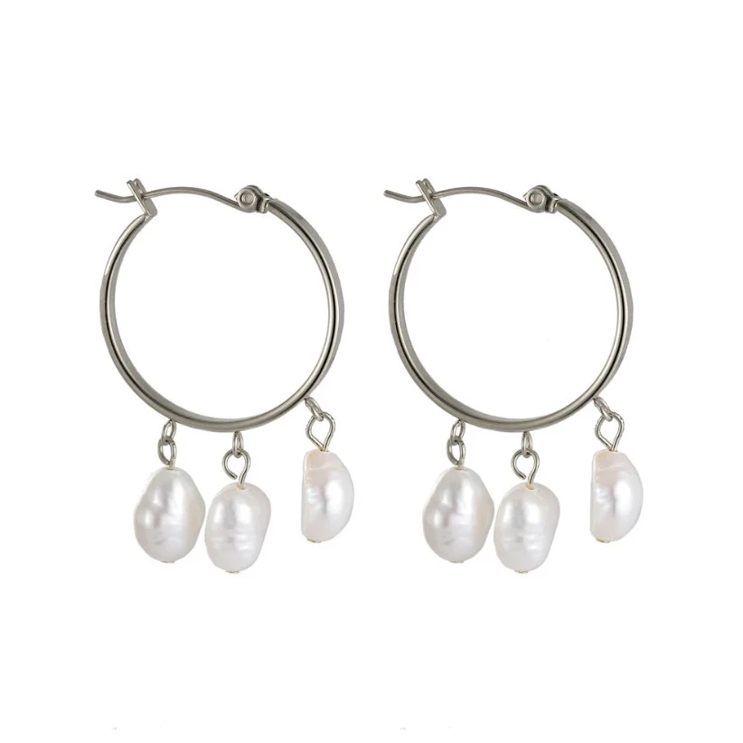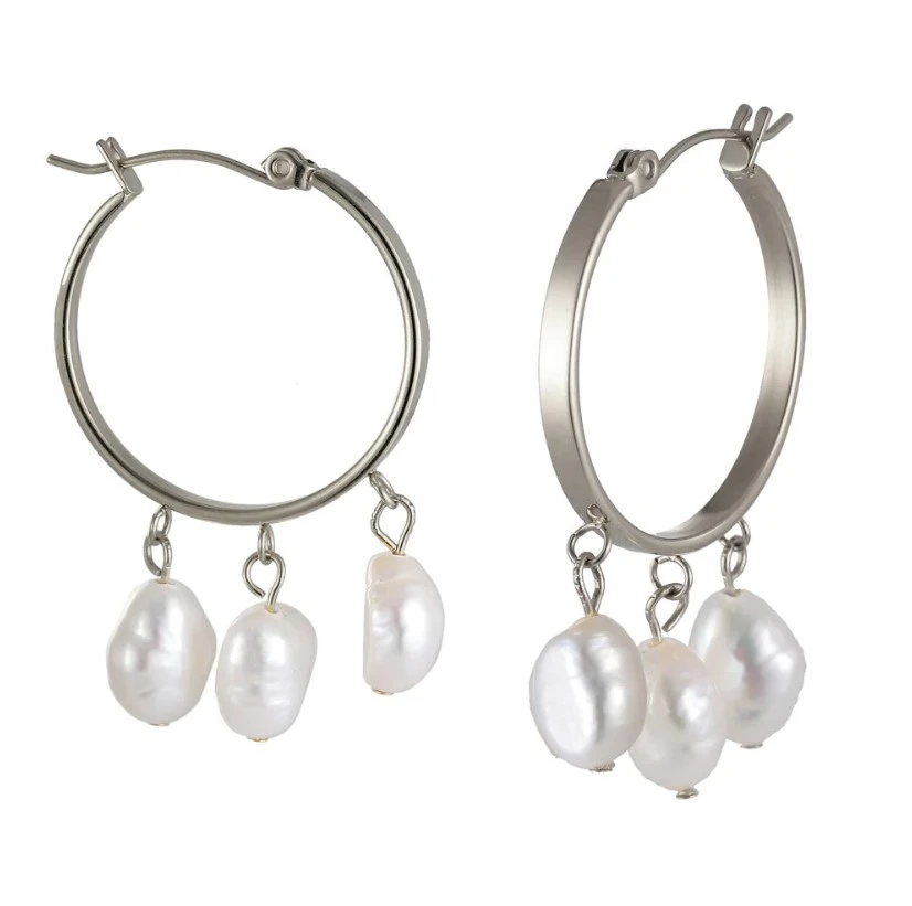 Kruhové náušnice z chirurgickej ocele ozdobené sladkovodnými perlami. Povrch náušníc je leštený, perličky majú bielu farbu. Vnútorný priemer náušníc 23mm, vonkajší 26mm. Náušnice majú zapínanie na francúzsky zámok.