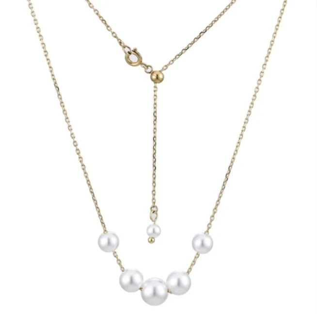 Jemný dámsky náhrdelník vyrobený z chirurgickej oceľ a prírodných perál. Retiazka vzoru anker má leštený pozlátený povrh, perličky dodávajú náhrdelníku nádych luxusu. Retiazka je široký 1,0mm. Perličky majú priemer 8,7,6 mm. Perlička pri zapínaní na perový krúžok má priemer 4mm. Dĺžku náhrdelníka je možné ľubovoľne nastaviť. Maximálna dĺžka náhrdelníka je 56cm.