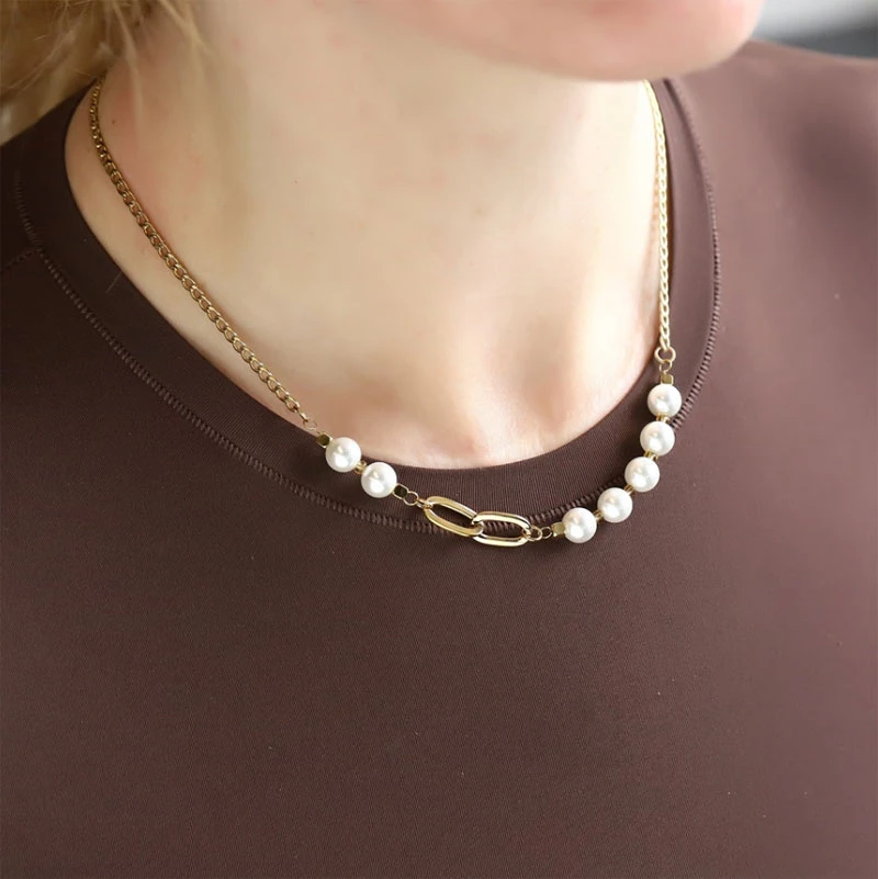 Náhrdelník z chirurgickej ocele zdobený kultivovanými perlami. Povrch náhrdelníka je pozlátený technológiou PVD. Biele perličky majú priemer 8mm. Veľké očká náhrdelníka majú rozmer 8x15mm. retiazkové časti vzoru pancr sú široké 3mm. Dĺžku náhrdelníka je možné nastaviť v rozmedzí dĺžok 45-50cm.