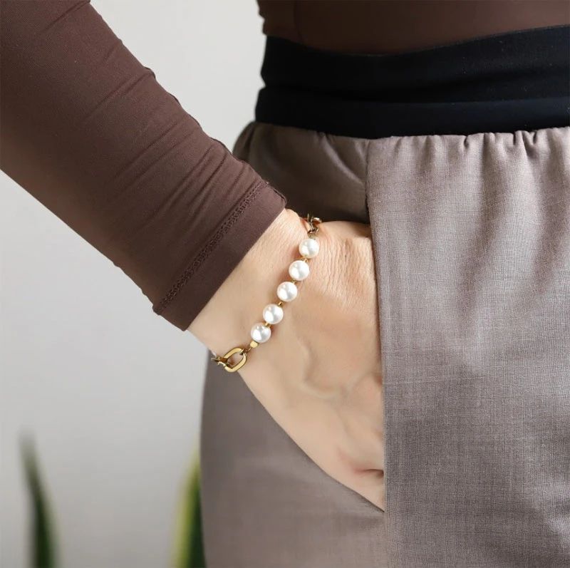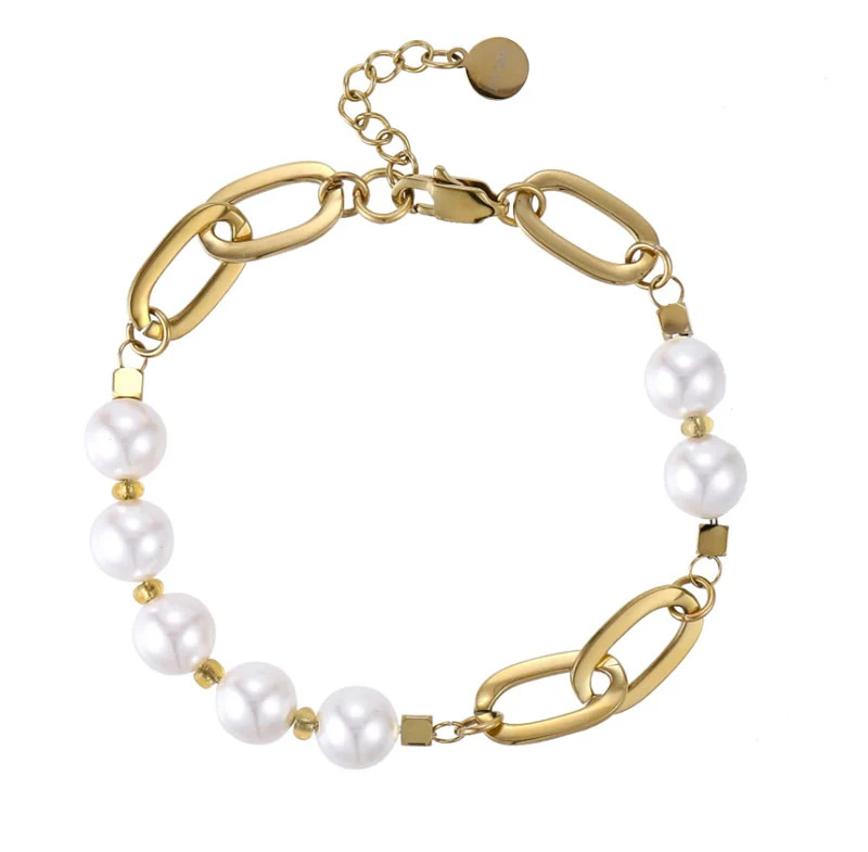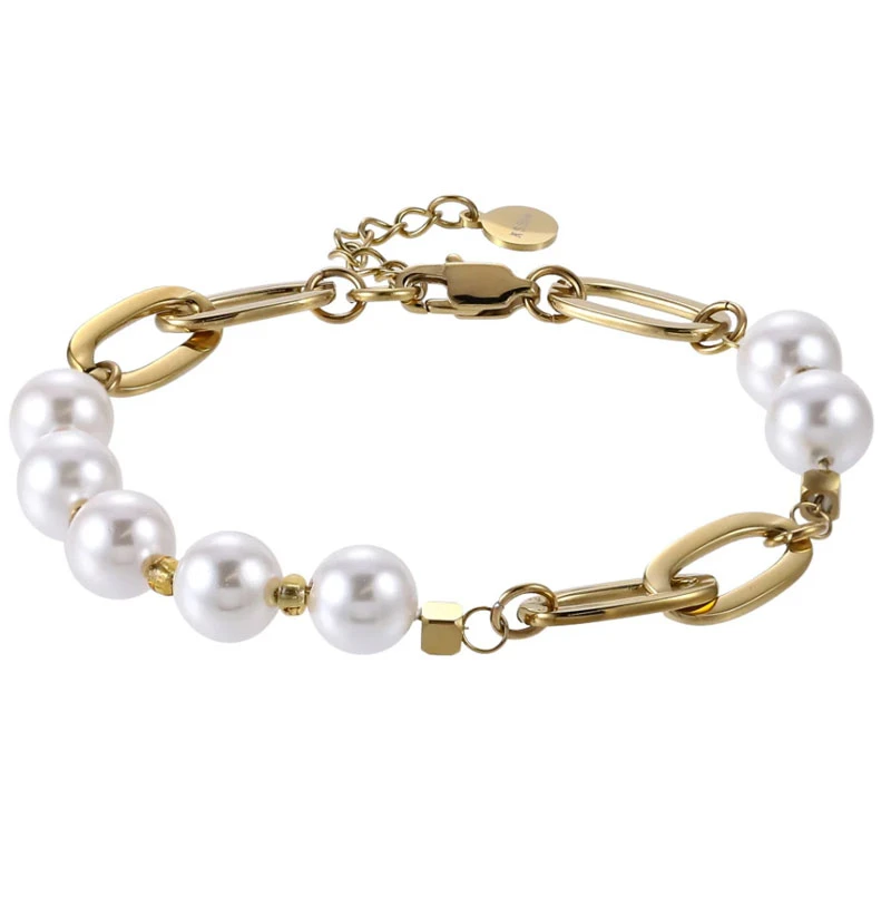 Náramok na ruku vyrobený z chirurgickej oceľ a prírodných perál. Povrch oceľových častí náramku je leštený pozlátený 14K žltým zlatom. Biele perličky dodávajú náramku nádych luxusu. Dĺžku náramku je možné nastaviť v rozmedzí 18 - 20cm. Perličky majú priemer 8mm, oválne články majú rozmer 8 x 15 mm. Náramok má karabínové zapínanie.