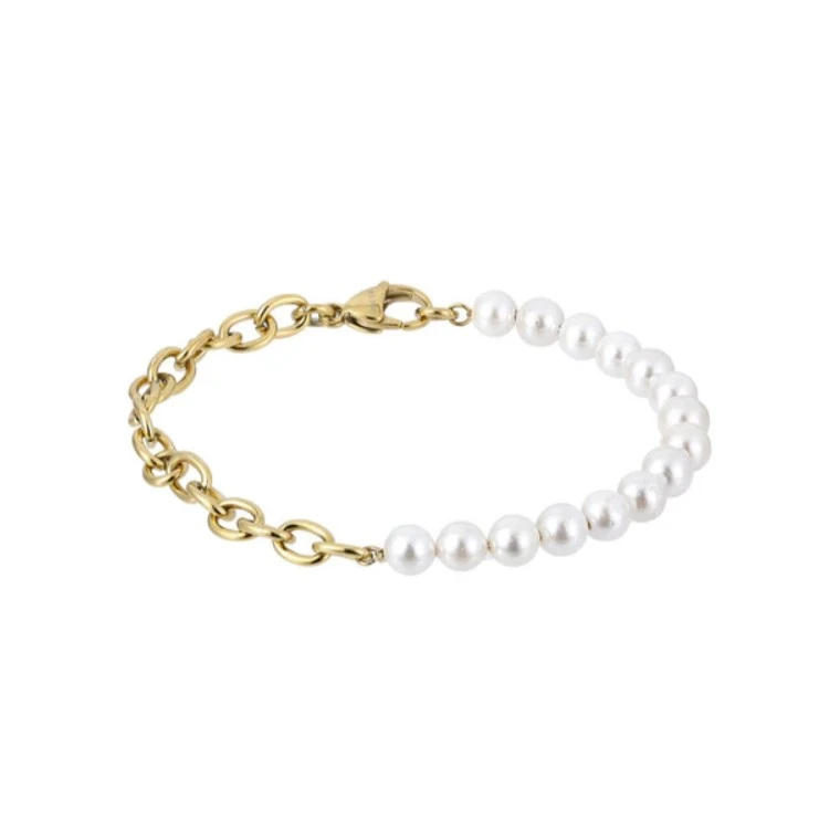 Náramok na ruku vyrobený z chirurgickej oceľ a prírodných perál. Povrch oceľových častí náramku je leštený pozlátený technológiou PVD, biele perličky dodávajú náramku nádych luxusu. Náramok je dlhý 20,5 cm. Perličky majú priemer 6mm, retiazková časť náramku je široká 6mm. Náramok má karabínové zapínanie.