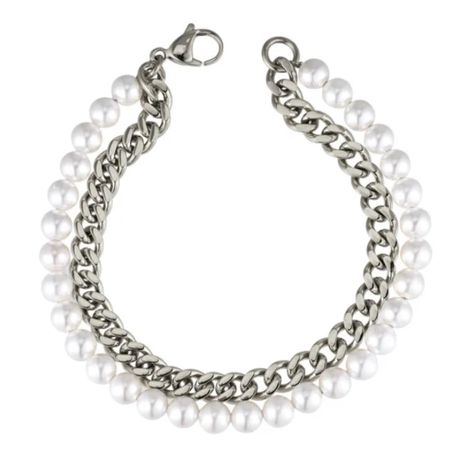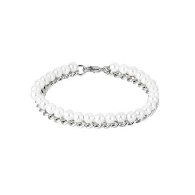 Náramok na ruku vyrobený z chirurgickej oceľ a prírodných perál. Povrch oceľových častí náramku je leštený, biele perličky dodávajú náramku nádych luxusu. Náramok je dlhý 21cm. Perličky majú priemer 6mm, retiazková časť náramku je široká 6mm. Náramok má karabínové zapínanie.