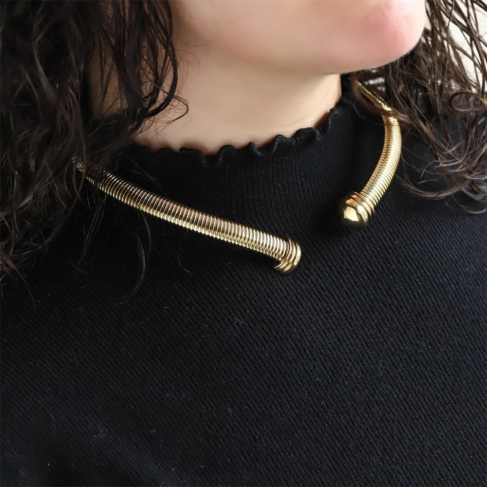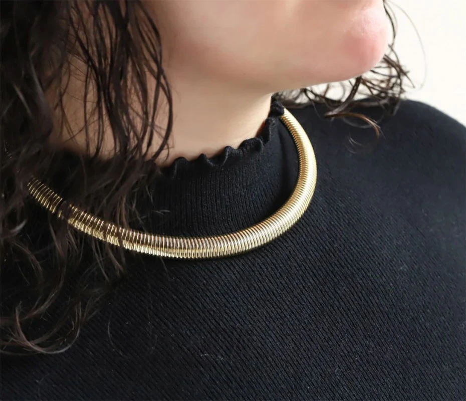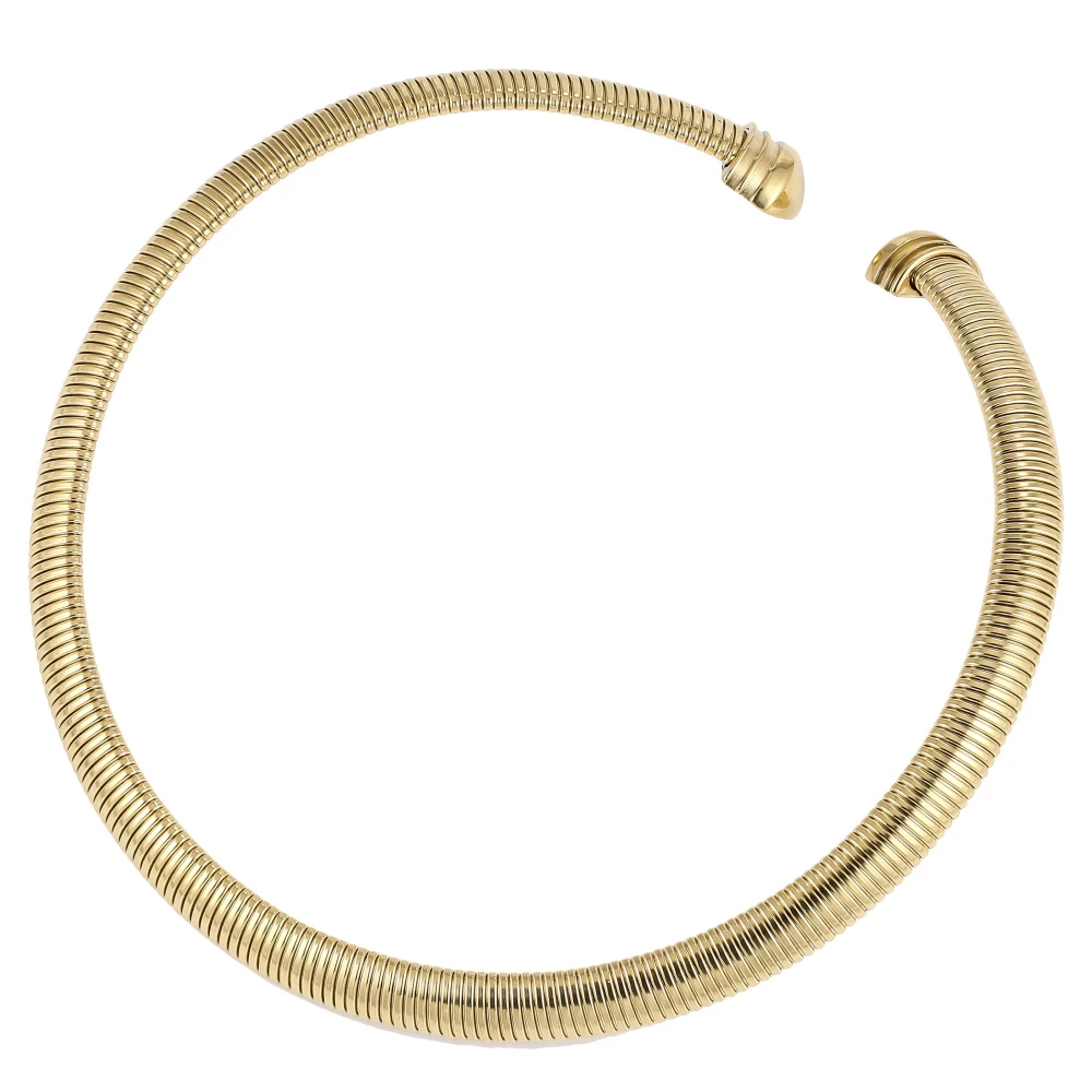 Pevný náhrdelník z chirurgickej ocele. Pozlátený povrch náhrdelníka je leštený. Vnútorný priemer náhrdelníka 130mm, šírka 10mm.