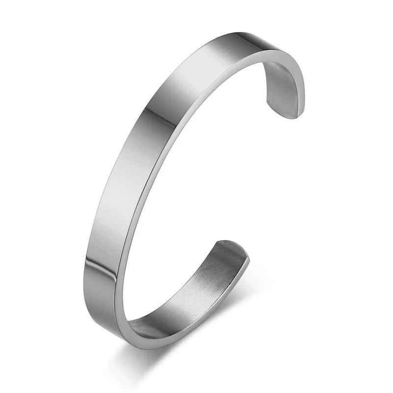 Oceľový pevný náramok na ruku z chirurgickej ocele. Povrch náramku na pohľadových stranách je leštený, vnútorná strana náramku je matná. Náramok je široký 8mm, vnútorný priemer náramku 60 mm.